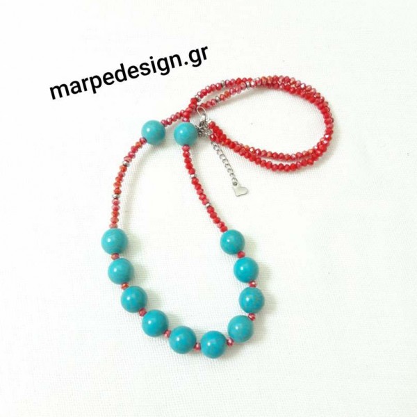 ΚΜΠΓ447-Κολιέ μήκους 60 εκ. από πάστα τυρκουάζ και κόκκινα κρύσταλλα