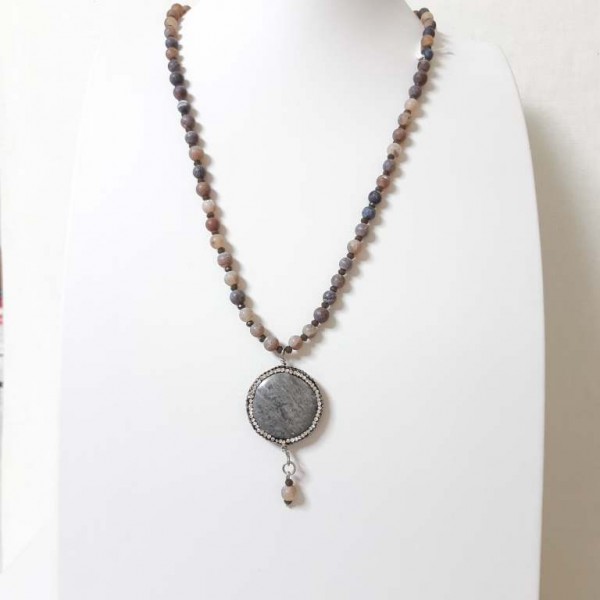 Κολιέ μήκους 52 εκ. από ματ γκρι-μπεζ κρύσταλλα και πέτρωμα γκρι μοτίφ με μαρκασίτυ