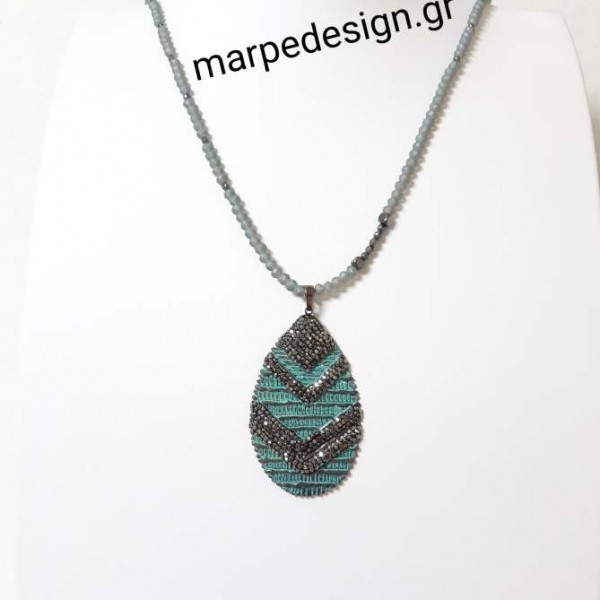 Κολιέ μήκους 80 εκ.από ματ κρύσταλλα και κεντρικό στοιχείο μέταλλο σε σχήμα σταγόνα αντικέ με μαρκασίτη