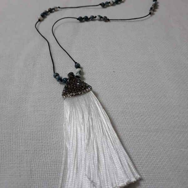 Κολιέ μήκους 75 εκ. με κορδόνι,πολύχρωμο τζέιντ ,μεταξωτή φούντα μήκους 9 εκ.άσπρη