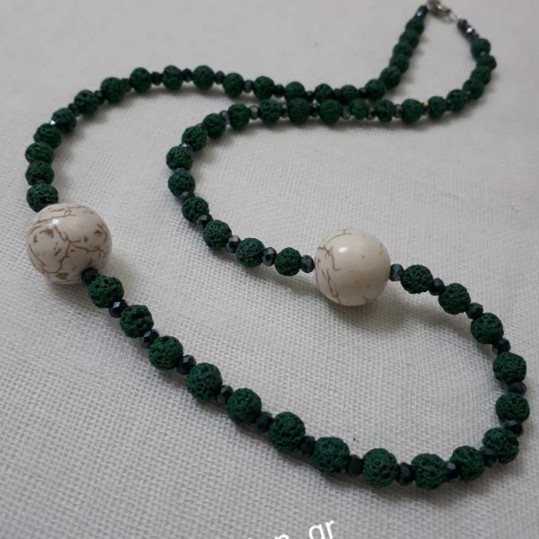 Κολιέ μήκους 63 εκ.με λάβα ,κρύσταλλα πράσινα και χαολίτες μπεζ