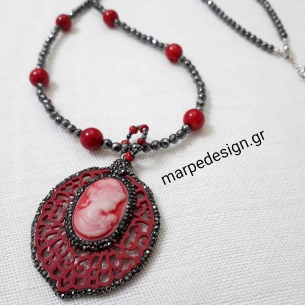 Κολιέ μήκους 70 εκ. από αιματίτη ,κοράλλια στρόγγυλα και στοιχείο καμέο με μαρκασίτη