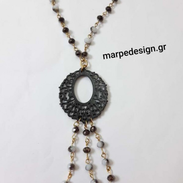 Κολιέ μήκους 70 εκ. περίπου ροζάριο από κρύσταλλα ασπρόμαυρα και στοιχείο από πάστα αχάτη μαύρο