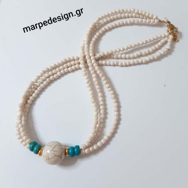 Κολιέ μήκους 45 εκ. από εκρού χαολίτη και ροδέλλες γαλάζιες χαολίτη και ατσάλινες επιχρυσωμένες