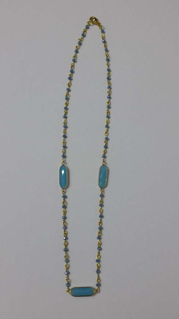 Κολιέ με 3 πέτρες aqua marine δεμένες σε χειροποίητο ροζάριο από ορείχαλκο